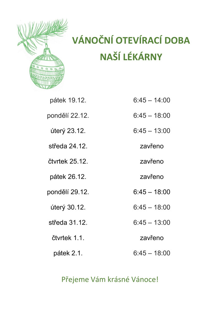 Otevírací doba lékárny SPEA ve dnech 19.12.2025 až 02.01.2026